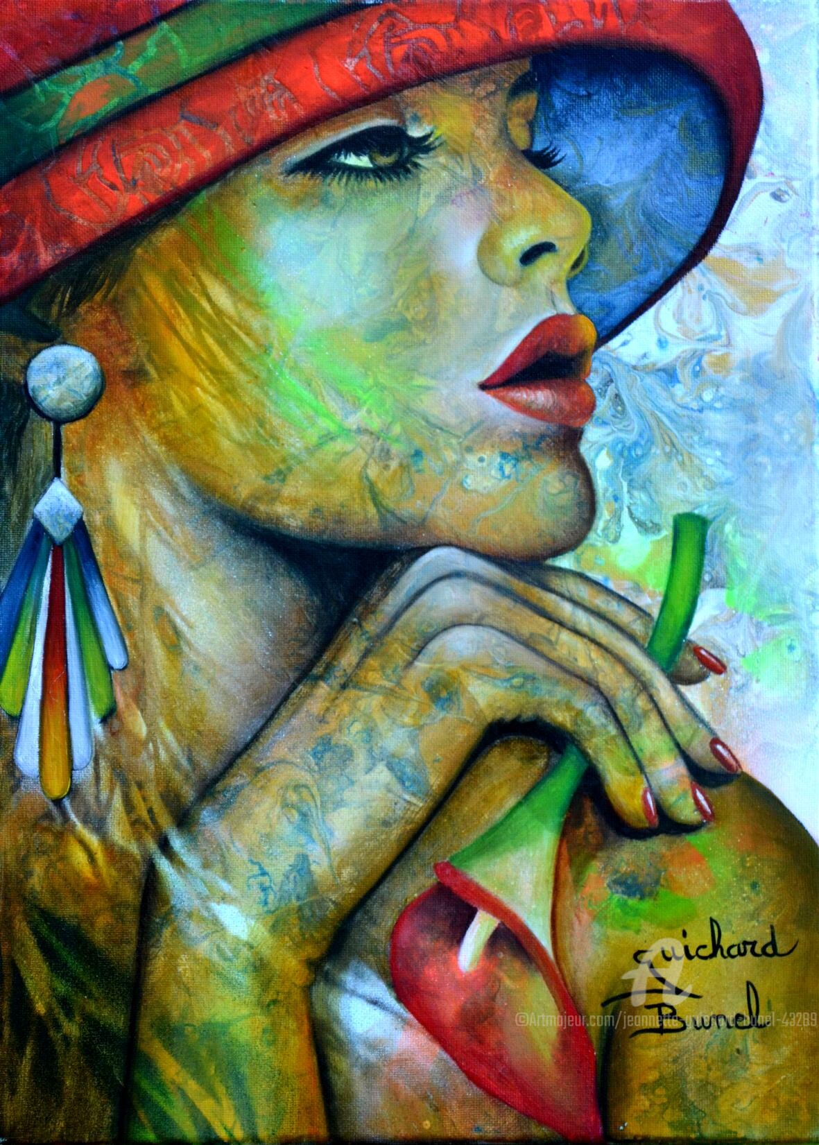 portait de femme à l huile , "désir" dans le langage des fleurs. jeu de transparences et de textures néo pop, technique des glacis